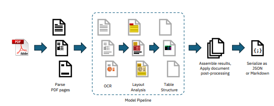 - Parse PDF pages 단계는 docling-parse(open-source a custom-built PDF parser, which is based on the low-level qpdf library. )를 이용해서 파싱 + pypdfium2를 이용해서 페이지 이미지 렌더링